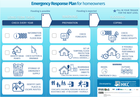 Floods can affect everyone, in the form of river floods and heavy rainfall, but also through sewer backflow and coastal flooding. It is therefore important to learn the right behaviour in an emergency situation in advance of the event. Behavioural preparedness is an important part of flood prevention, as appropriate preparation can significantly reduce damage. Knowledge of the specific hazard is the basis for an appropriate response to the hazard. In addition to protective measures, this also includes behavioural precautions, such as preparing an emergency response plan and an emergency bag.