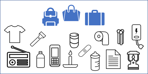 The emergency bag shows examples of items that should be on hand in the event of a flood or other emergency, such as important documents, food, water and emergency communication equipment. The bag can be grabbed and the building evacuated immediately because all the necessary items have been safely packed in advance.