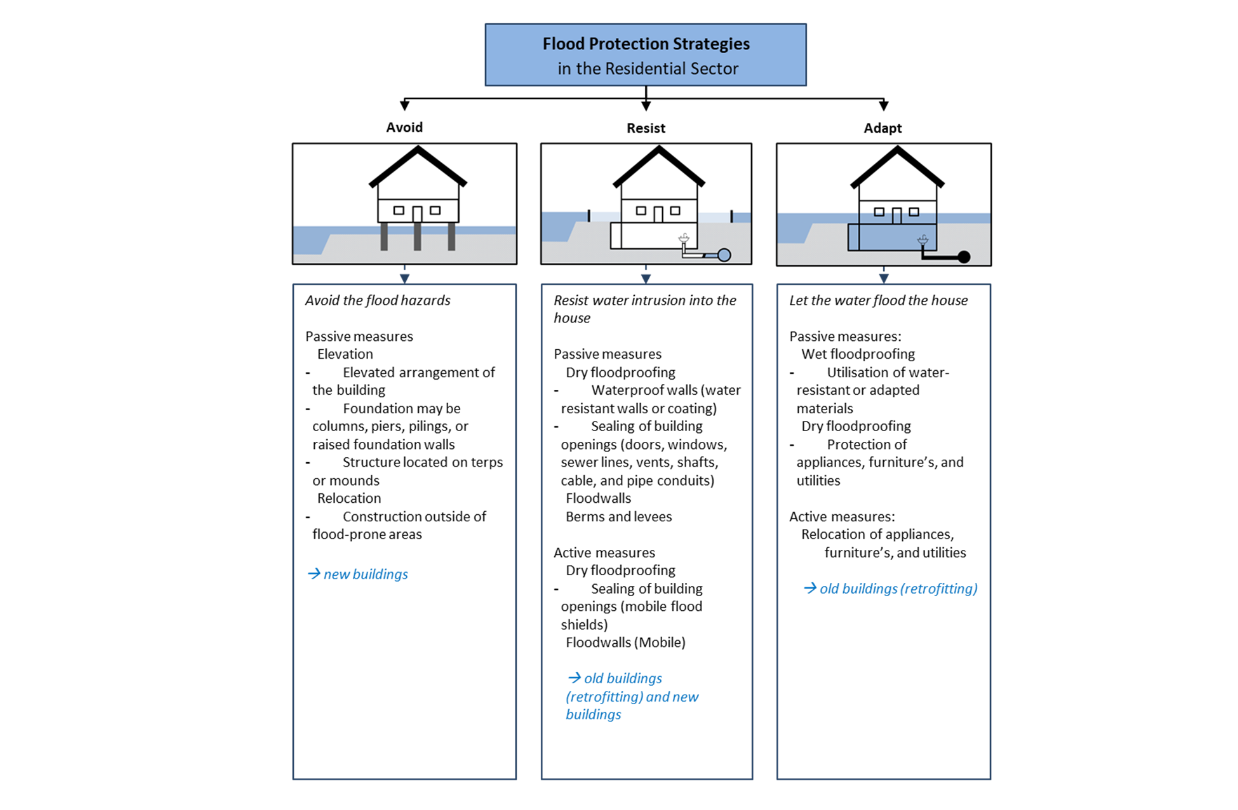 The task of floodproofing is to limit the damage potential to the property. This can either be done by protecting the house/building from water affecting the building either from the outside, from entering the building through intrusion routes or adapting the building to flood water.